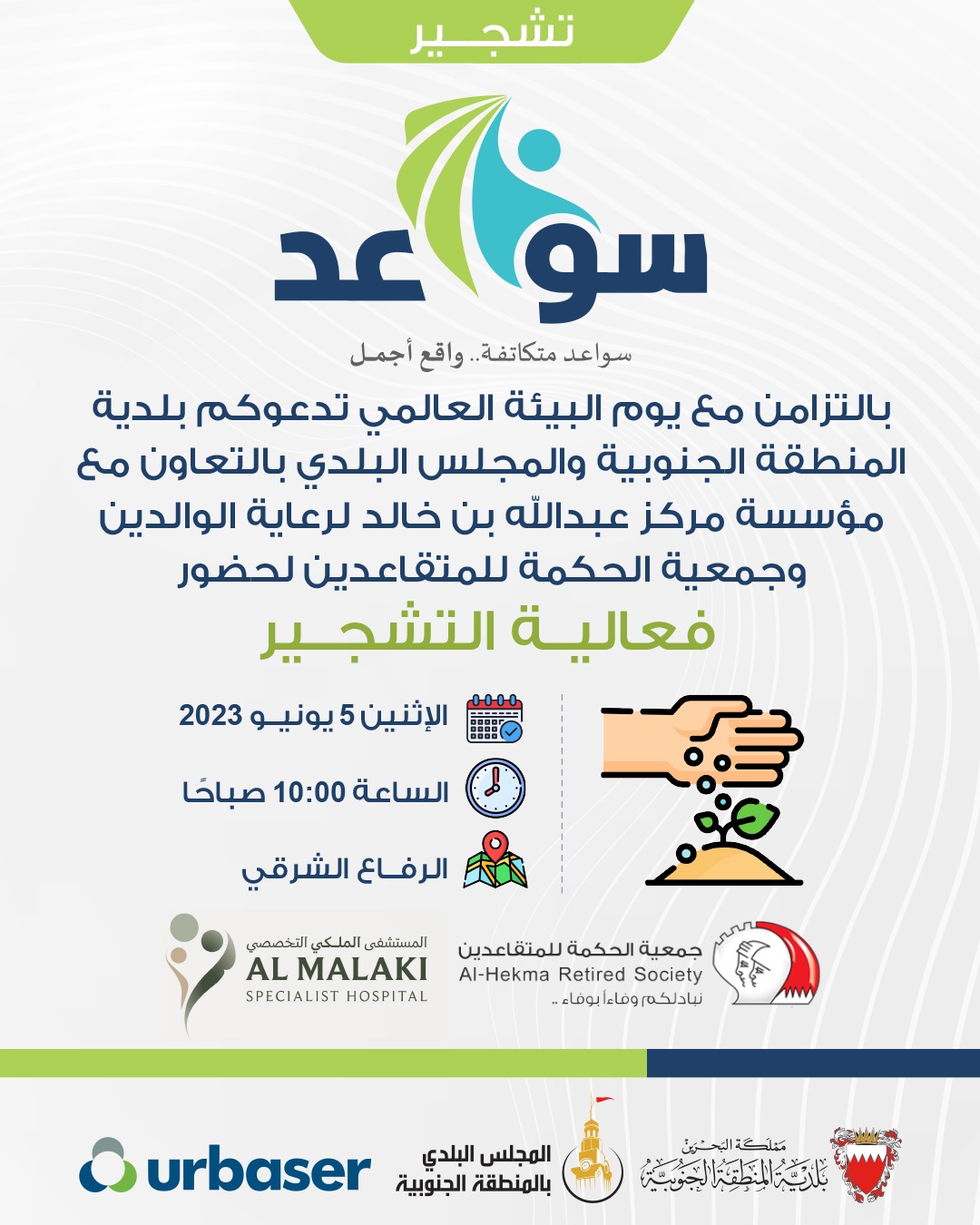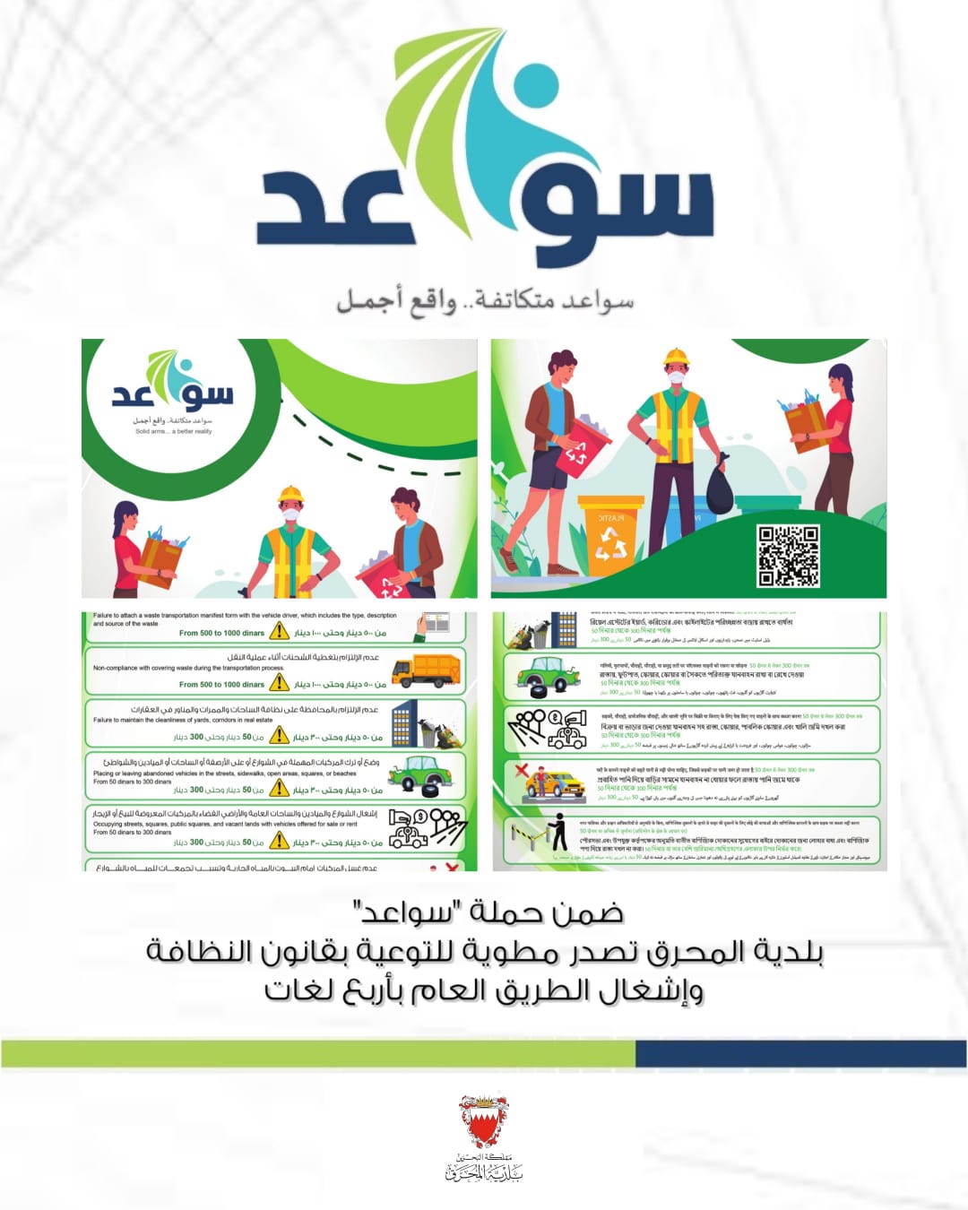 وأوضح أن فعاليات (سواعد) هي عبارة عن حملة لزيادة التفاعل المجتمعي والتي من خلالها ستتضمن افتتاح عدد من المشاريع الخدمية، وزراعة عدد من الأشجار في كل محافظة تفعيلاً للإستراتيجية الوطنية للتشجير، وعمل جداريات في كل محافظة من خلال إيصال الفن لمناطق البحرين من خلال اختيار مواقع مميزة في قلب هذه المناطق. كما تكون فرصة للفنانين التشكيليين لتحويل بصماتهم الفنية من الشكل التقليدي إلى واجهه حضارية فنية تمثل ثقافة المنطقة نفسها".